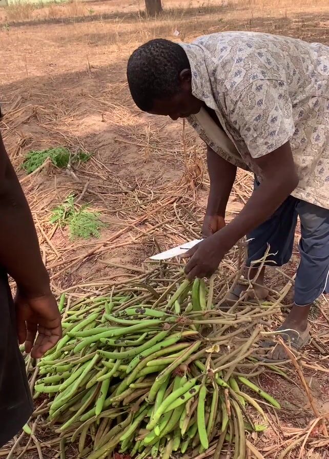 man cutting green beans off of stalks with a knife. He is standing in a field with dry grass and some trees in the background. There is a building in the distance. Another person is standing to the left of the man cutting the beans, but only their arm is visible. The man cutting the beans is wearing a patterned shirt, dark pants, and sandals. The pile of beans is large.