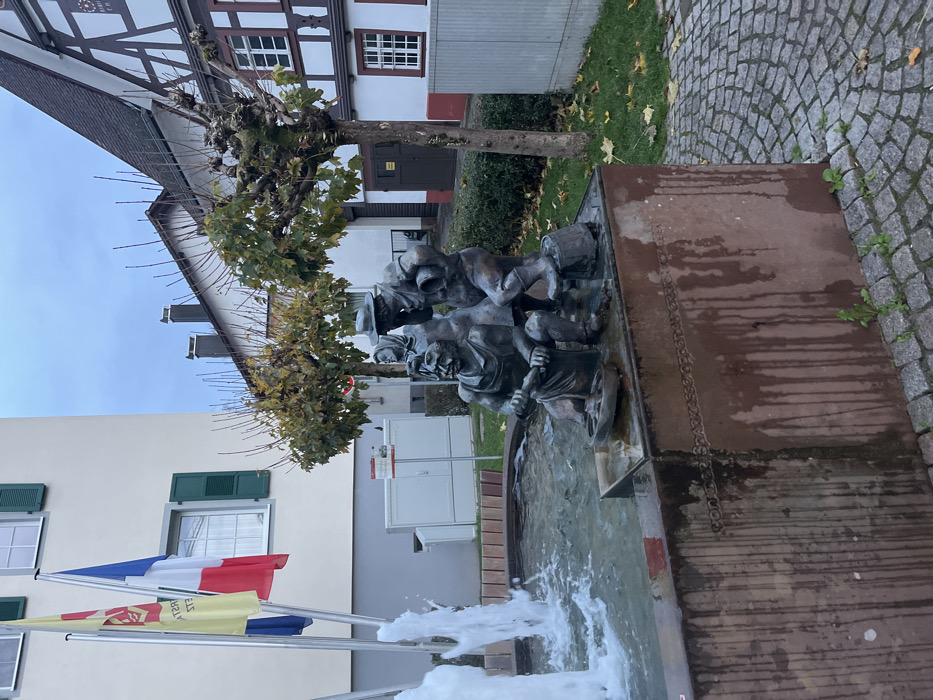 This image depicts a public square in Oppenau, Germany, featuring a functional fountain and a bronze sculpture