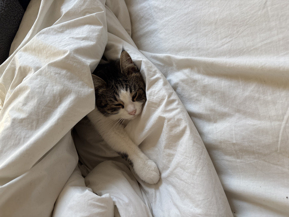 - "A domestic cat is depicted resting beneath white bedding within an indoor environment, located in the city of Romainville, France" by FM-06do12, licensed under CC BY 4.0