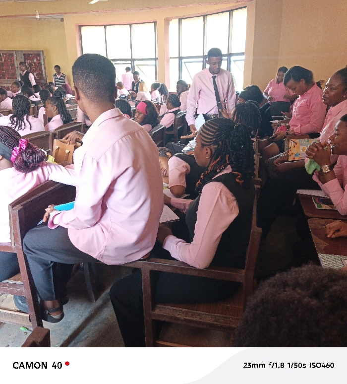 This image captures an indoor scene within a classroom or lecture hall in Agbani, Nigeria. Approximately thirty individuals, appearing to be students and possibly an instructor, are present. Most individuals are seated at worn wooden desks and chairs arranged in rows. A consistent dress code is evident, with many participants wearing light pink button-down shirts. Some males wear dark ties and dark trousers with their pink shirts, while some females wear dark vests over their pink shirts or dark trousers. In the midground, a male individual in a pink shirt, dark tie, and dark trousers stands in an aisle, holding papers and appearing to address a seated student on the right. Seated individuals are engaged in various activities; some look towards the front, others are focused on papers or notebooks on their desks. A student in the foreground, with their back partially to the camera, holds a light blue object, possibly a folder or book. Papers and writing materials are visible on multiple desks. The room features light-colored walls and large windows in the background, allowing natural light to enter. Overhead, a ceiling fan and fluorescent light fixtures are visible. The floor is a light-colored, unadorned surface.