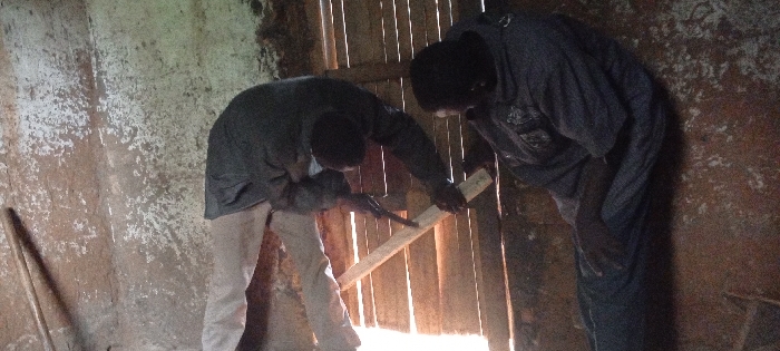 In Abengwa, Democratic Republic of the Congo, two individuals are observed indoors. The interior features rough, discolored walls with patches of lighter material on a reddish-brown base. On the left, a slender wooden pole leans against the wall. A bright light source illuminates vertical wooden slats, possibly a door or window, in the background. The individual on the left wears a dark long-sleeved top and light-colored trousers. This person is bent over, holding a dark-colored tool, possibly pliers, and is engaged with a light-colored wooden slat. The individual on the right, dressed in a dark long-sleeved top and dark trousers, is also bent over, holding the wooden slat and observing or assisting the first individual. Their interaction suggests a joint task involving the manipulation of the wooden slat.