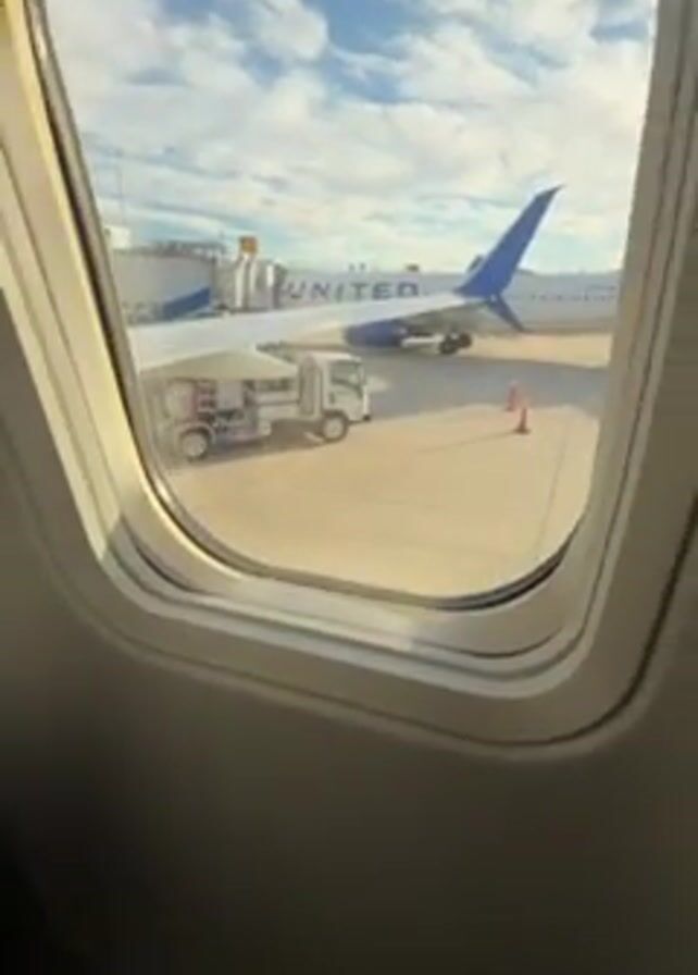 view from the window of a United Airlines plane. Other United Airlines planes are visible outside the window, along with ground crew vehicles. The sky is blue with scattered clouds, and the sun is shining brightly. The planes are parked on a tarmac. The video seems to be taken either before takeoff or after landing, while the plane is stationary at the gate.