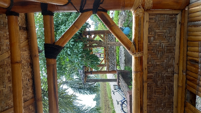 Framed by bamboo construction, a glimpse of the outdoors is captured
