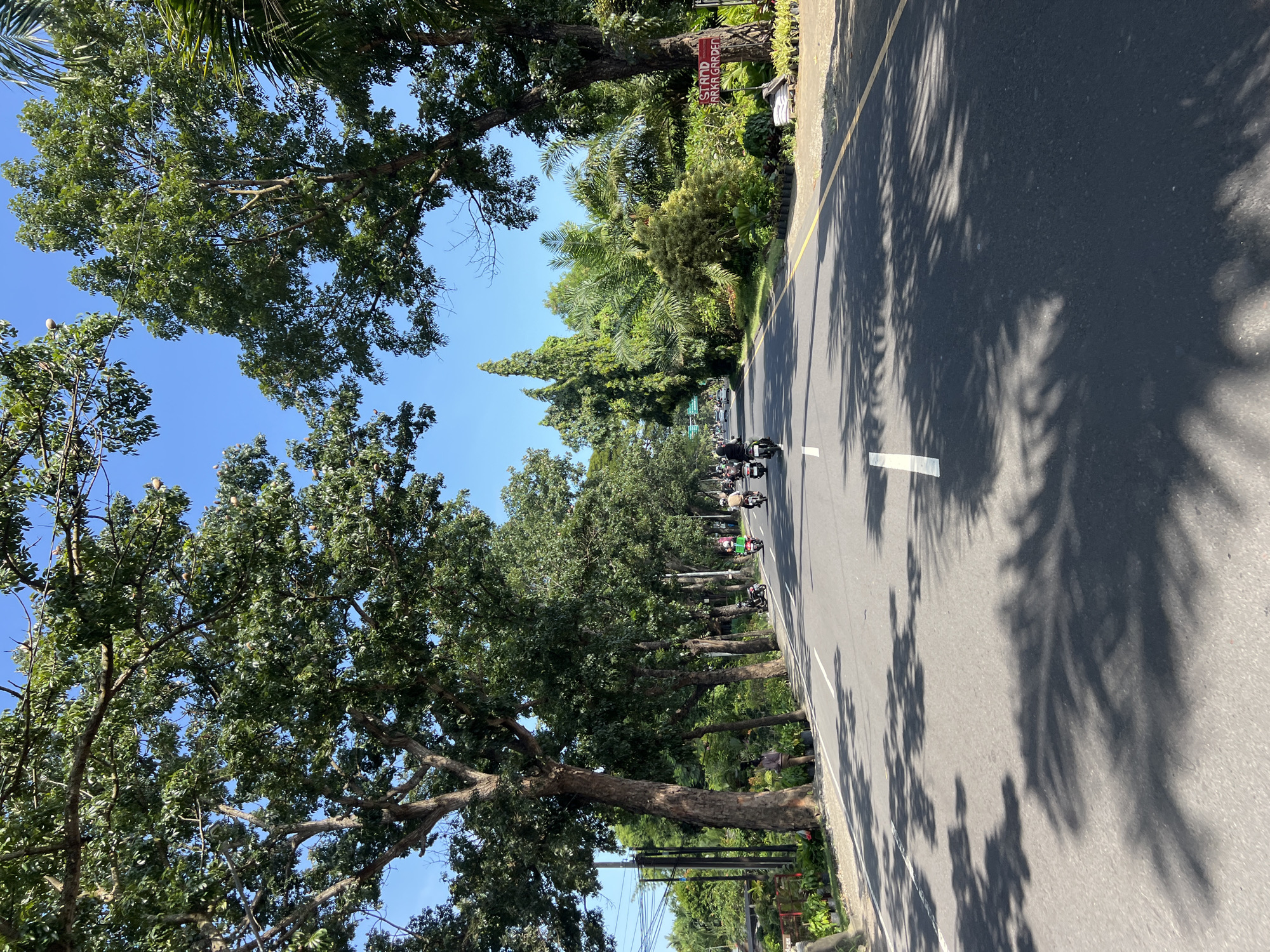The image captures a street scene in Denpasar, Indonesia, under a clear blue sky. A two-lane asphalt road stretches into the distance, marked with a solid yellow line on one side and a broken white line in the center. Several motorbikes are driving along the road, clustered in the distance. The road is flanked by lush, mature trees casting shadows across the pavement. On one side of the road is a sign that reads "STRAND PARK GARDEN" amidst dense greenery. Utility poles and wires are visible along the edge of the road. The scene depicts a typical day in Denpasar, showcasing its tropical environment and transportation infrastructure.
