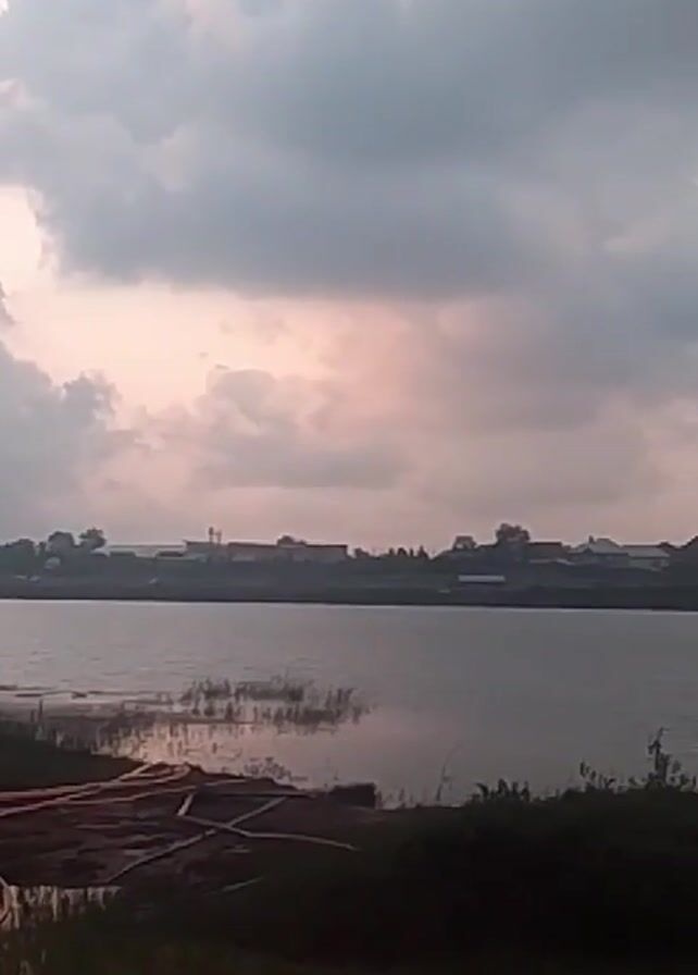 The camera shows a body of water on a cloudy day. The water is calm and reflects the sky. On the opposite shore, a cluster of buildings can be seen, shrouded in the distance and gray weather. In the foreground, a series of hoses lie on the ground, interspersed with patches of green grass and mud. The sky is overcast with gray and white clouds, with some patches of pinkish hue.