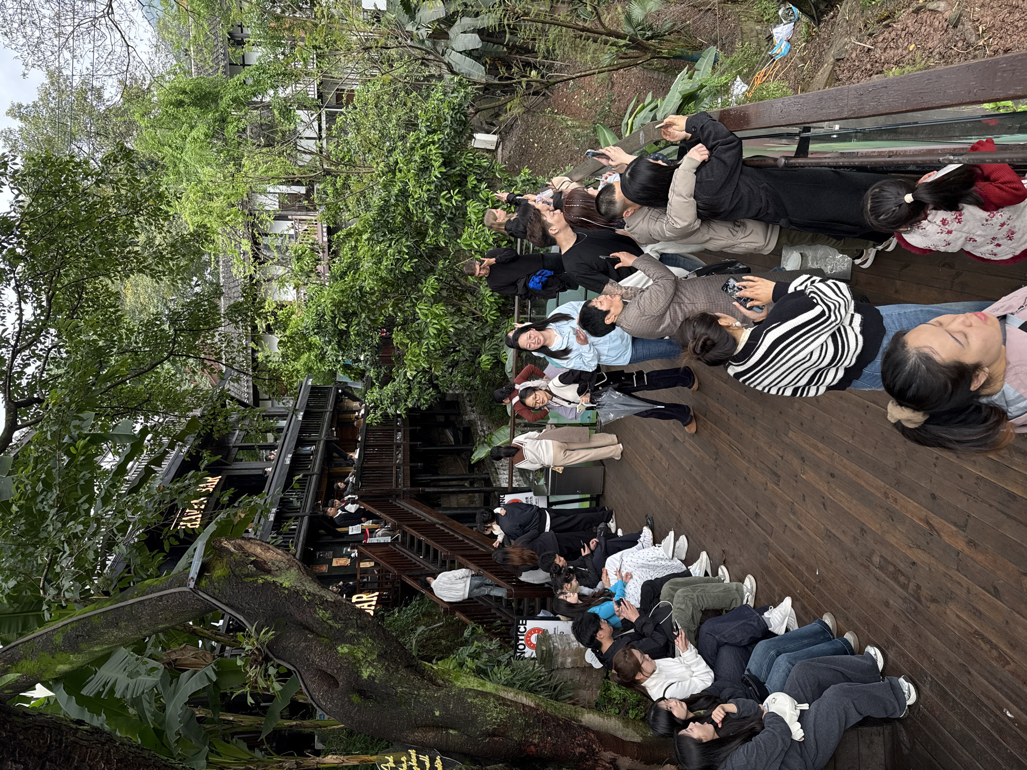 The image displays an outdoor, multi-level pedestrian area located in the Nan'an District, China. The scene is characterized by extensive wooden decking, lush green vegetation, and traditional-style architecture under an overcast sky. A multi-story dark wooden building, identified by a sign as "HAVEN BAR," is prominent on the left and center-background, featuring balconies and wooden staircases. Numerous trees, including one with a moss-covered trunk, and large-leafed plants are abundant throughout the environment. Approximately 40 to 50 individuals, predominantly East Asian adults, are present. On the left foreground, a group of about 8-10 people are seated on a low wooden bench; most are actively looking at or interacting with their mobile phones. In the middle ground, several individuals are seen ascending and descending the wooden stairs leading to the "HAVEN BAR," and a white "NOTICE" sign with a red graphic is visible near the staircase base. One woman stands holding a clear umbrella. On the right, a large group of 20-25 individuals stands along a wooden railing, gazing outwards toward a view. A significant number of these individuals are holding up mobile phones, appearing to photograph or record the scenery beyond the railing, which consists of a steeply sloping natural terrain covered with brown earth and dense greenery. A young girl in a red and white floral top is positioned near the railing. All individuals are dressed in casual attire, including jackets, sweaters, jeans, and sneakers.