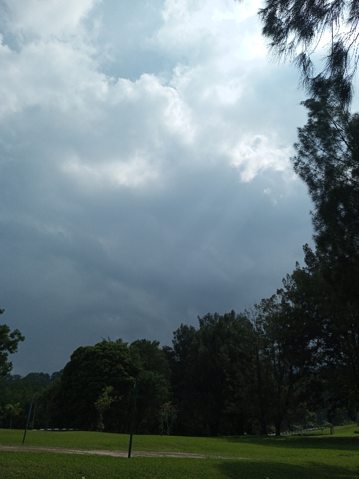 The scene is an outdoor landscape under a predominantly overcast sky, located in New Serchhip, India. The sky occupies the upper two-thirds of the frame, characterized by dense, dark grey cloud cover, indicating impending weather. A brighter area of sky with partially obscured sunlight is visible in the upper right. Silhouetted, dark green foliage from a coniferous tree extends into the frame from the upper right. The lower third features a wide expanse of green lawn, traversed by a lighter dirt path in the foreground. Several dark, slender poles are vertically placed within the grassy area. A dense line of dark green trees forms the horizon in the mid-ground. There are no people, animals, or specific activities visible in the image.
