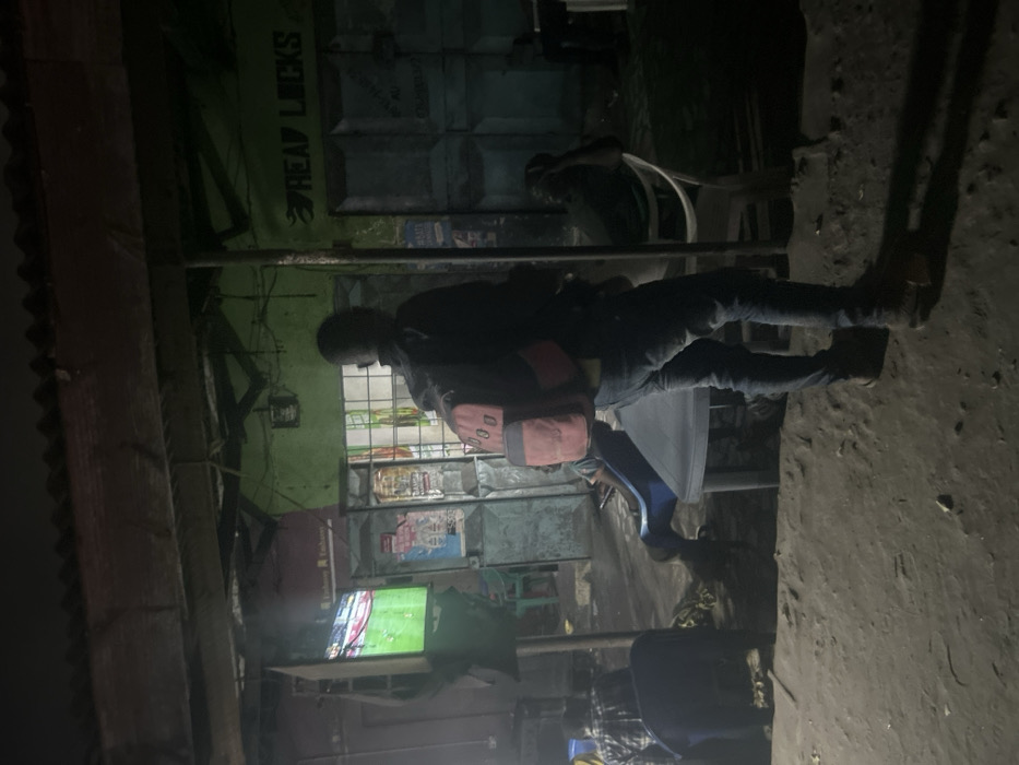 A dimly lit scene reveals a person in a dark jacket, jeans, and brown boots, standing under a corrugated roof structure. A red and orange bag rests on their back. They appear to be watching a television displaying a sports game. Another individual sits in a white chair in the background. The surroundings consist of a weathered building with closed stalls and the words "HEAD LOCKS" visible on a green wall. The ground is rugged and uneven.