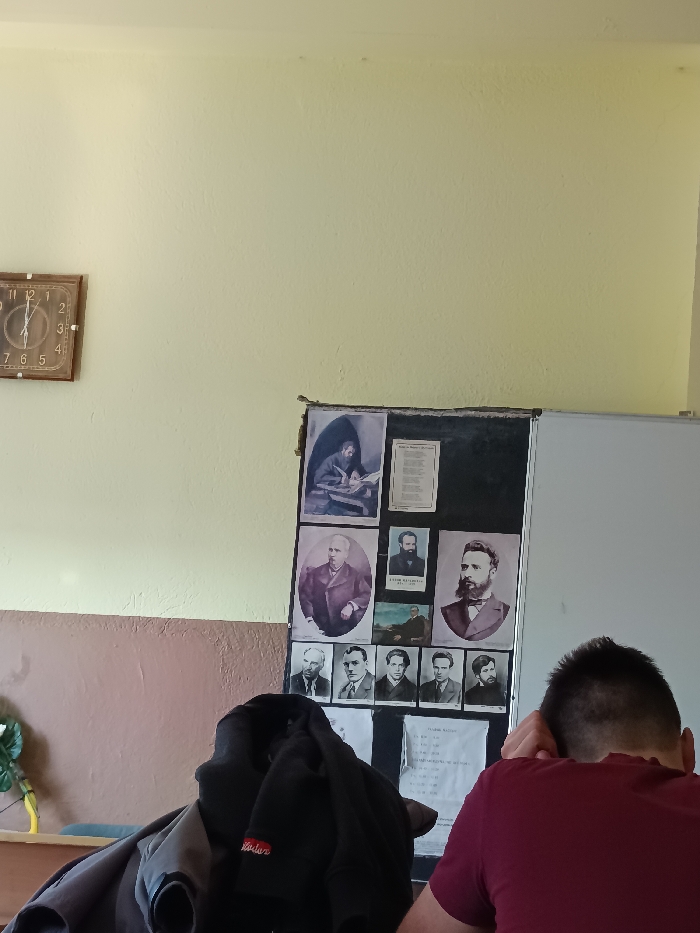The image depicts an indoor scene within an educational setting located in Kazichene, Bulgaria. The upper portion of the wall is painted a light yellow, while the lower segment is a medium brown/beige. A square, wooden-framed analog wall clock is mounted on the left wall, displaying hands indicative of a time between 7 and 8 o'clock. Centrally positioned is a dark-colored bulletin board, displaying a collection of portraits and documents. The top left features a portrait of a bearded man seated, engaged in writing, adjacent to a text document. Below this, a large oval portrait shows a man in a suit, flanked by two other portraits: one of a man identified as "LYUBEN KARAVELOV 1834-1879" and another of a bearded man. Five smaller portraits of men are arranged in a row below these larger ones. Below the portraits, two sheets of paper containing text are pinned to the board. To the right of the bulletin board, a plain white marker board is visible. In the foreground, the back of an individual's head and upper torso is visible on the right. The person has short, dark hair and is wearing a maroon short-sleeved shirt. Their right arm is bent, with their hand resting near their head, indicating a posture of rest or contemplation. A dark jacket, with a visible "Dickies" brand label, is draped over a chair or desk in the lower-left foreground, next to a partially visible green plant. The room is well-lit, with soft ambient light.