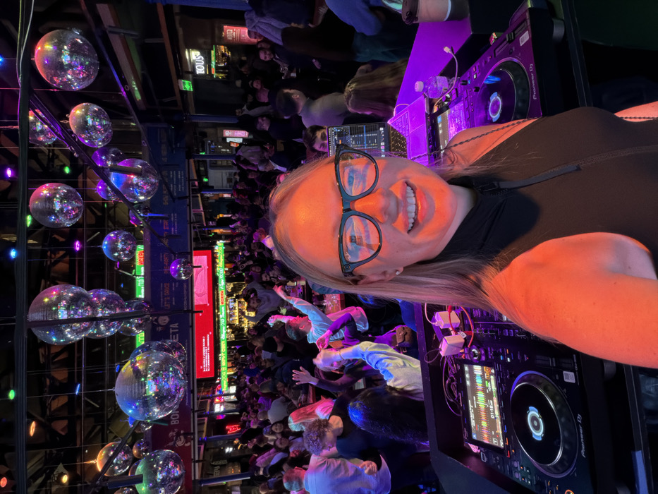 A DJ smiles at the camera while working in a crowded nightclub