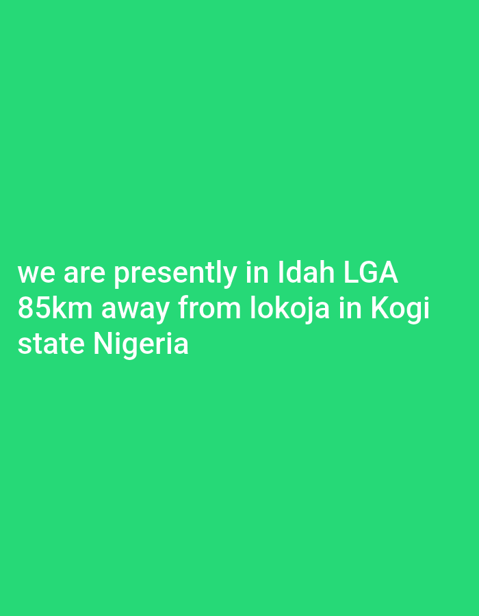 The image is a solid green background with white text that says "we are presently in Idah LGA 85km away from Lokoja in Kogi state Nigeria"