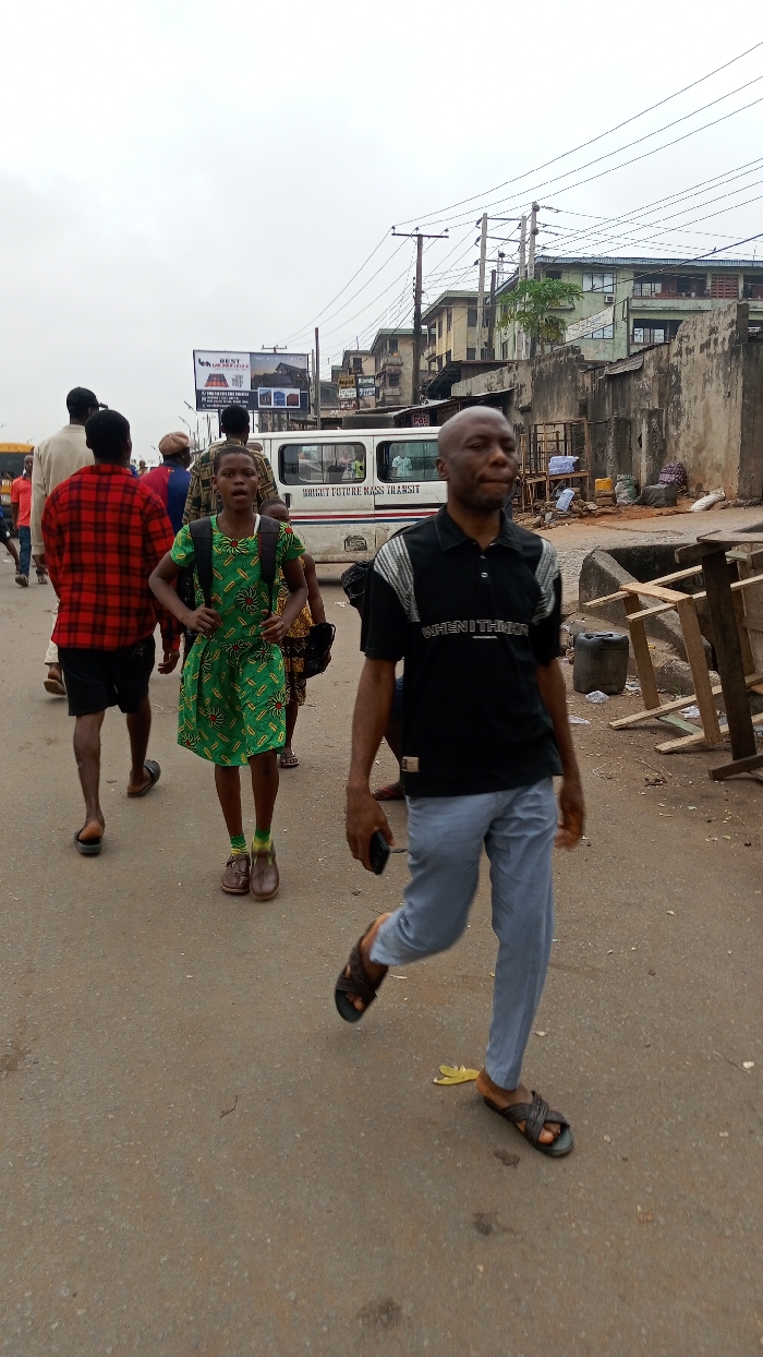 This image depicts a bustling street scene in Ogbunike, Nigeria, under an overcast sky. In the foreground, a paved road with visible wear and scattered debris, including a yellow banana peel near the lower right. Three individuals are prominently featured. On the right, a bald, dark-skinned male adult walks towards the left-center of the frame, mid-stride. He wears a black short-sleeved polo shirt with white and grey striped detailing on the shoulders and chest, and text that reads "WHEN I THINK" on the front. He has light blue trousers and dark, cross-strap sandals, and holds a black smartphone in his right hand. In the center, a dark-skinned young girl, approximately 8-12 years old, walks forward, looking towards the viewer with her mouth slightly open. She wears a vibrant green short-sleeved dress with a repeating circular pattern, a dark backpack, and brown shoes with light green socks. To her left, slightly behind her, a dark-skinned male adult walks away from the viewer, facing left. He wears a red and black plaid short-sleeved shirt, dark shorts, and dark sandals. In the midground, other blurred pedestrians are visible. A white minibus, likely a commercial passenger vehicle, is parked or slowly moving towards the left, with "BRIGHT FUTURE MASS TRANSIT" stenciled on its side. The background reveals a dense urban environment. Multi-story buildings, varying in architectural style and state of repair, line both sides of the street. Prominent utility poles with numerous overhead power lines crisscross the upper portion of the frame. On the right, a weathered concrete wall with exposed rebar forms a boundary, behind which discarded items, including wooden structures, plastic barrels, and sacks, are visible. A large billboard, featuring images of buildings and text, is visible on the left side of the street.