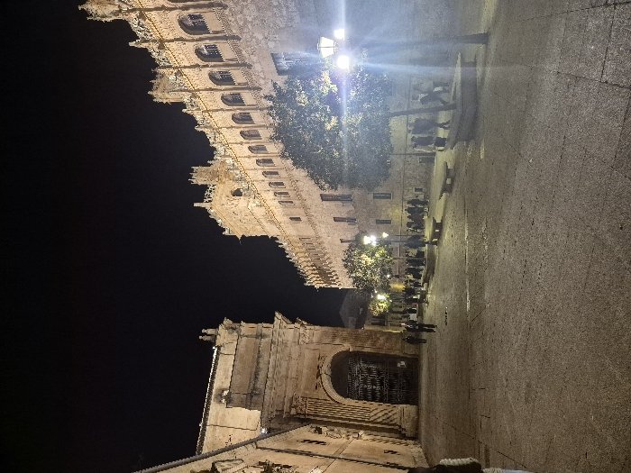 The image displays a nighttime scene within the Plaza de Monterrey in Salamanca, Spain. The foreground features a large, paved stone plaza, illuminated by artificial lighting from multiple streetlights. On the right side of the image, the multi-story Palacio de Monterrey is prominent, characterized by its ornate Renaissance architectural style, featuring numerous arched windows across several levels and an intricately sculpted parapet. This building is illuminated by warm, artificial light, highlighting its detailed stonework. On the left side of the image, a robust, light-colored stone archway is visible, likely part of the Convento de San Esteban complex. A large, dark, grilled gate is set within this archway. In the middle ground of the plaza, several small, leafy trees are interspersed, also illuminated by streetlights, which create areas of light and shadow. Multiple stone benches without backs are situated in various positions on the plaza. Numerous individuals are present in the middle ground, appearing as indistinct figures due to distance and lighting conditions. They are primarily grouped along the right side of the plaza, near the base of the Palacio de Monterrey, engaged in walking or standing. A few additional figures are visible near the archway on the left. The scene is lit by multiple tall streetlights with spherical globes, one of which in the lower right foreground emits a distinct lens flare. The sky above is dark, indicating night. A partial human figure is visible in the extreme lower-left corner of the frame.