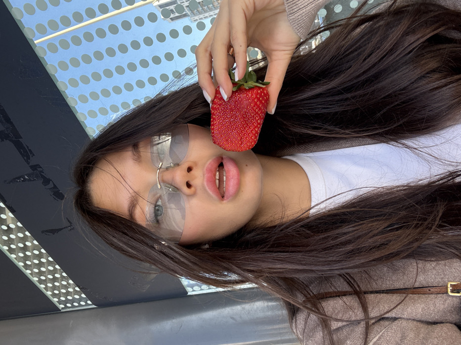 A young female subject is observed in a close-up, outdoors in Petah Tikva, Israel. She possesses long, dark brown hair and wears rimless, light-tinted rectangular sunglasses. Her lips are slightly parted, revealing a portion of her upper and lower teeth. She is dressed in a white ribbed top overlaid by a light brown or beige jacket. A dark strap with a gold-colored buckle is visible on her left shoulder, suggesting a bag. In her right hand, she holds a large, ripe red strawberry with prominent green calyx leaves, positioned near her mouth. Her fingernails are painted white, and a ring is visible on the ring finger of her right hand. The background consists of a dark vertical pillar on the left and a translucent or semi-transparent panel featuring a white circular dot pattern on the right, behind which a blue sky and distant modern high-rise buildings are discernible.