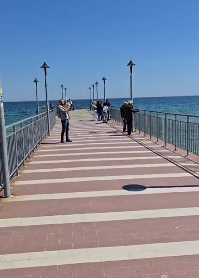 pier stretching out over the sea on a bright, sunny day. The pier has a striped walkway of red and white bricks. Gray metal railings line both sides of the pier, punctuated by evenly spaced lampposts. Several people are visible on the pier, including one man standing near the camera taking pictures with his phone. Other people are standing further down the pier, some looking out at the water. The sea is calm and a clear, bright blue. The sky is cloudless and a deeper shade of blue.