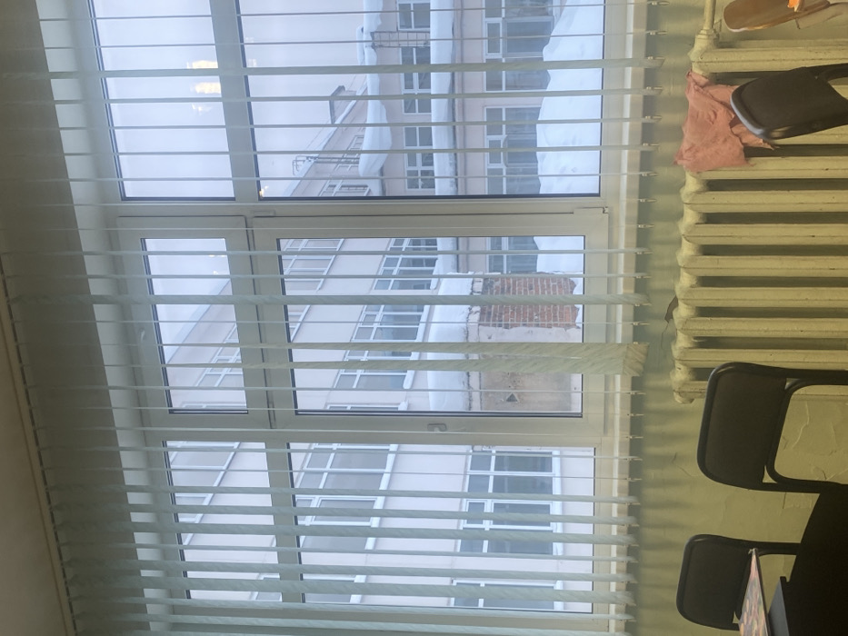 The image displays an interior perspective looking out a multi-pane window with partially opened vertical blinds, revealing an exterior winter scene in Прикамский, Russia. The window frame is white. Below the window, a light greenish-yellow wall is visible, featuring a white, horizontally segmented radiator. A reddish-pink fabric item is draped over the right side of the radiator. In the lower left foreground, two dark-colored chairs with metal frames are partially visible, alongside a small section of a table containing papers. Through the window, an urban environment under overcast skies is observed. The ground and all visible building roofs are covered with a substantial layer of snow. Directly across, a light-colored, multi-story building with numerous rectangular windows is prominent. To the right of this building, another section of a similar structure is visible, along with a partially exposed brick structure, possibly a chimney or a damaged wall, also topped with snow. No individuals or active subjects are present in the scene.