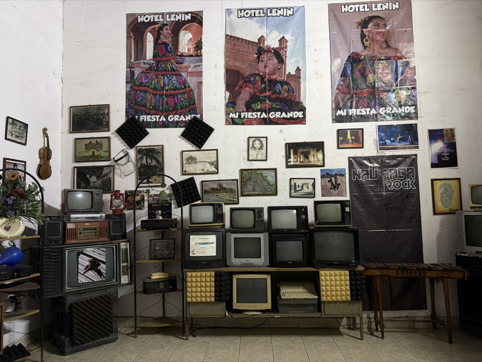 An eccentric interior showcases a collection of vintage electronics. Old television sets are stacked on shelving units, interspersed with audio equipment and various framed pictures adorning the wall behind. Posters advertising "Hotel Lenin" with images of women in traditional dresses are prominent above. Additional wall decor includes black sound-absorbing panels, and a black banner with "Naupaca Rock." A violin hangs on the left wall, and a xylophone stands on the right, adding to the room's eclectic character.