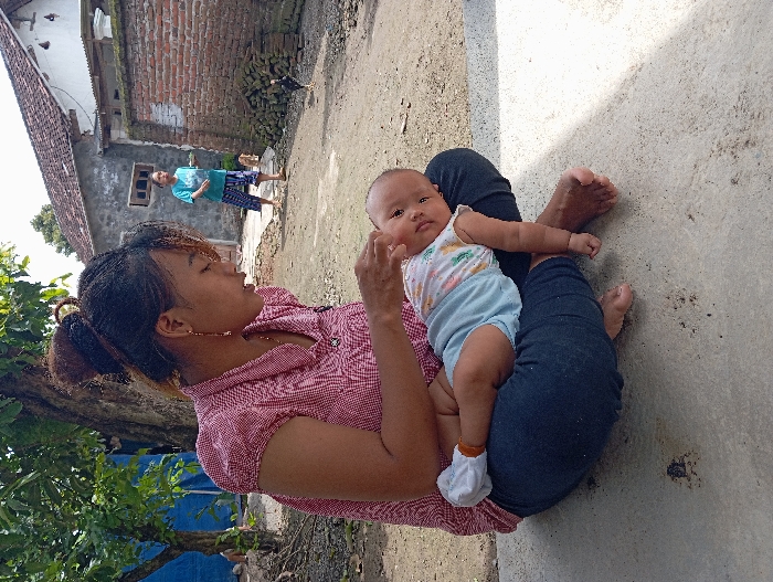 An outdoor scene in the city of Waung, Indonesia, features an adult female seated barefoot and cross-legged on a concrete surface in the foreground. She wears a red and white checkered short-sleeved top and dark jeans, with her dark hair styled in an updo, and is looking down while gently touching an infant resting on her lap. The infant, dressed in a patterned white sleeveless top, light blue shorts, and one white sock on its left foot, lies on its back across her thighs, looking towards the viewer. In the midground, a second adult female wearing a light blue top and patterned shorts stands on a dirt path, facing away from the primary subjects, holding a small light-colored object in her left hand. A dark-feathered rooster is on the dirt path to her right, and a small, light-colored dog is partially visible behind her. The background consists of a grey-walled house with a tiled roof and a low, partially crumbling brick wall. Green tree foliage is visible on the left. The scene is illuminated by bright daylight.