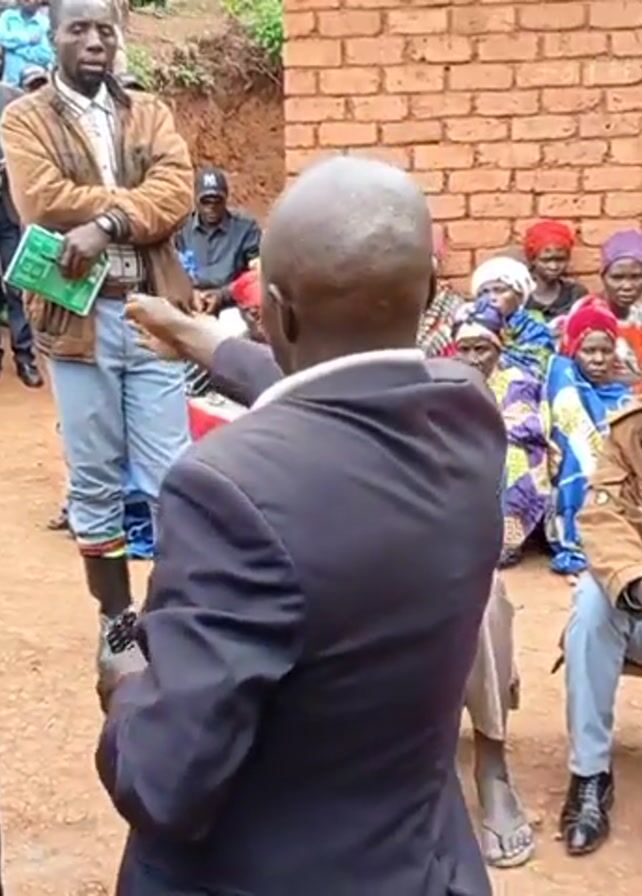 gathering of people in an outdoor setting, likely a rural area. The focal point of the scene is a group of seated women dressed in colorful attire and headscarves. They are gathered around a man seated on a chair holding a long staff. Several men in suits stand facing the group, appearing to be addressing them. Behind the seated group is a brick building with a blue door. In the foreground, there are miscellaneous objects including containers and what appears to be a root or object of significance placed on the ground. There are additional people standing further back, observing the scene.
