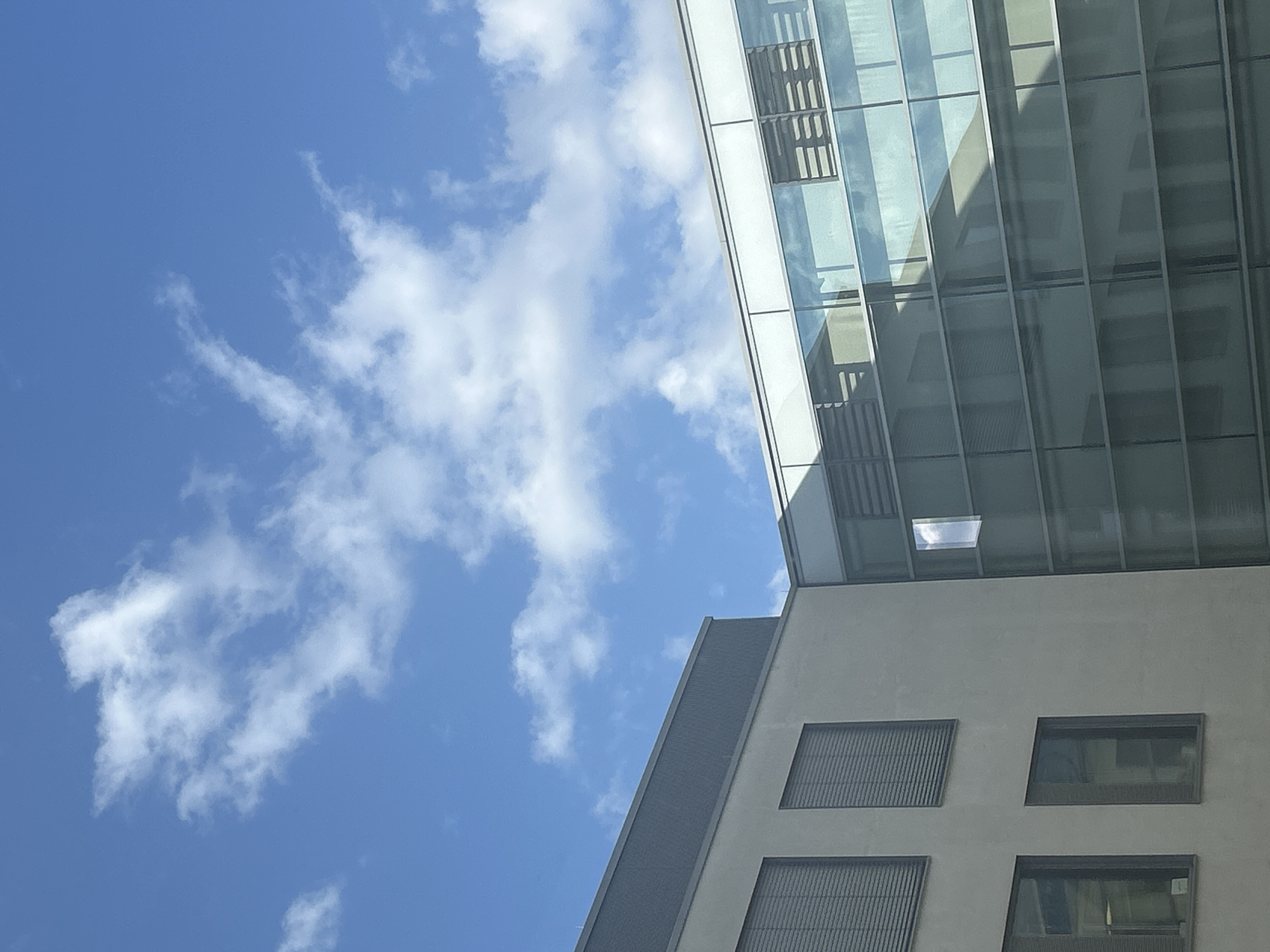 The image displays a clear blue sky with scattered white cumulus clouds, observed above modern architectural structures. The location is in Heidelberg, Germany, specifically within the Neuenheimer Feld campus, likely associated with the Heidelberg University Hospital or a research institute. On the left, a multi-story building constructed of light grey material is visible, topped by a flat, dark grey roof section. This building features multiple rectangular windows equipped with closed external Venetian blinds (raffstores); at least two larger windows are on an upper level and two smaller windows are on a lower level. To the right, a contemporary building presents a multi-story glass curtain wall facade with distinct horizontal framing. This glass facade reflects portions of the adjacent light grey building and the sky. A small, rectangular window within the glass facade is visibly open, reflecting a white cloud. Sunlight is evident, illuminating the scene. No individuals, vehicles, or specific activities are depicted.