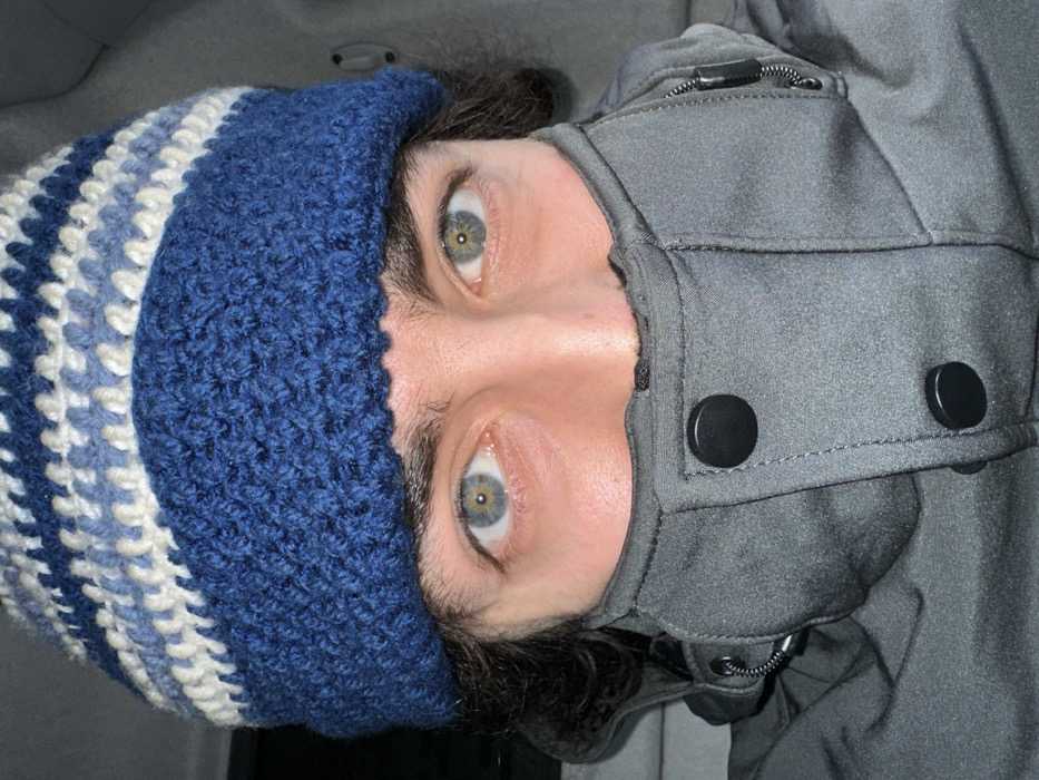A close-up image depicts an individual from the mid-chest upwards, situated in an interior setting, possibly a vehicle, in Wasquehal, France. The subject wears a crocheted beanie featuring horizontal stripes in dark blue, light blue, and off-white. Dark, curly hair is visible beneath the beanie, framing the face. A dark grey or charcoal-colored jacket with a high collar is worn, pulled up to obscure the nose, mouth, and chin. The jacket features two visible large black circular buttons on the front collar placket and a black zipper pull tab on the right side of the collar. The individual's eyes are light blue-green with central darker rings and are directed straight towards the camera. Dark, prominent eyebrows are visible. The background is dark and indistinct, with a lighter grey object faintly discernible in the upper right.