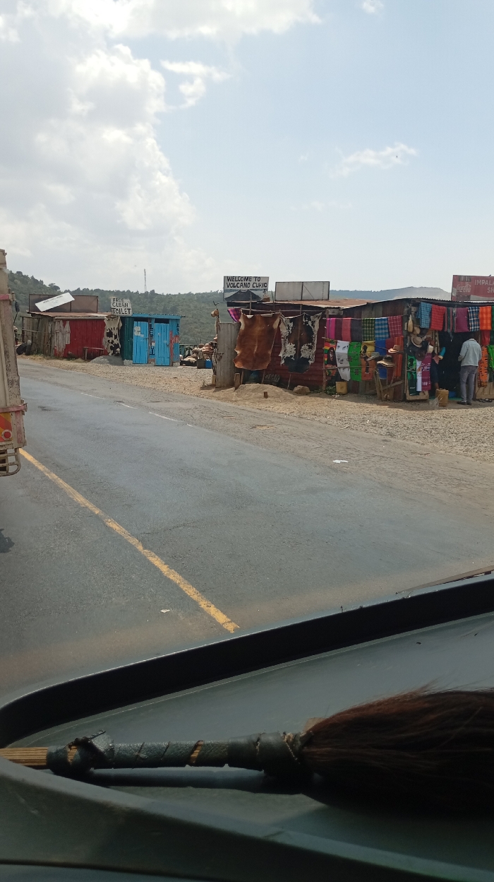 The image depicts a roadside market scene located in Lari/Kirenya ward, Kenya, viewed from inside a vehicle. A two-lane asphalt road with a solid yellow dividing line extends from the bottom center into the midground. On the left, the rear section of a large, red and white truck is partially visible. The foreground shows a dark-colored vehicle dashboard with a wooden stick featuring a dark, fibrous tassel (possibly a fly-whisk) resting horizontally. Along the right side of the road, a series of makeshift market stalls are constructed from corrugated metal and painted wood. The closest prominent stall on the right features a sign reading "WELCOME TO VOLCANO CURIO S." This stall displays multiple animal hides, including a large brown one and a black-and-white spotted one, along with numerous colorful textiles and woven goods. One individual wearing light-colored trousers and a shirt stands within this stall, facing away from the camera. Further right, a partial view of another stall shows a "Coca-Cola" sign and displays more colorful fabrics. Further down the road, on the right, is a distinct blue structure with a sign proclaiming "FREE CLEAN TOILET." Behind this, another red-painted stall is visible. The ground immediately adjacent to the road and around the stalls is unpaved, appearing dry and dusty. In the background, green hills with sparse vegetation rise under a sky with scattered white clouds. The overall scene suggests a commercial stop along a rural or semi-urban roadway.
