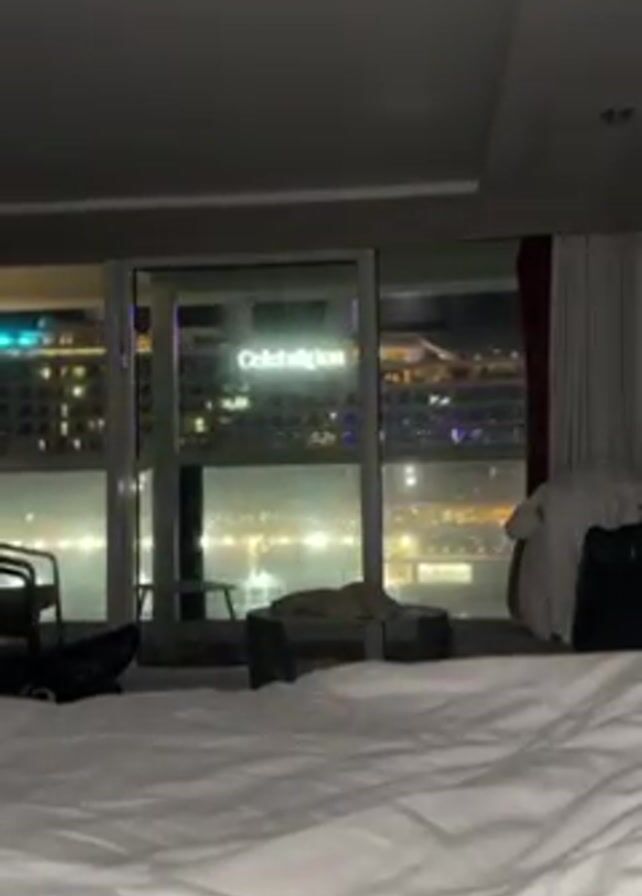 From inside a dim room, the camera focuses on a large window, through which a brightly lit cruise ship is visible. The ship's name, "Celebration," is prominently displayed. In the foreground, a bed with white linens and a bedside table with clothing on it can be seen. The overall scene suggests a view from a hotel room or similar accommodation overlooking a port or harbor.