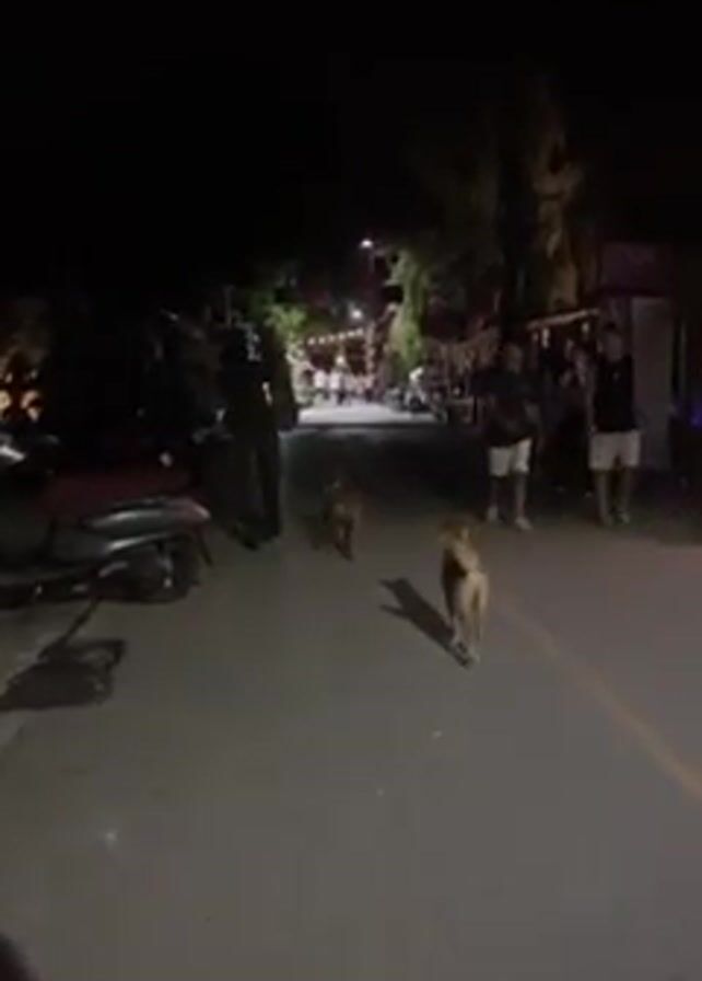 street scene at night. The street is lit by overhead lights and the lights from nearby businesses. On the left side of the frame are several parked scooters. A few pedestrians walk down the street in the distance. Three light-brown dogs stand or walk in the foreground, towards the camera. A man in dark clothing stands close to the dogs, interacting with them.