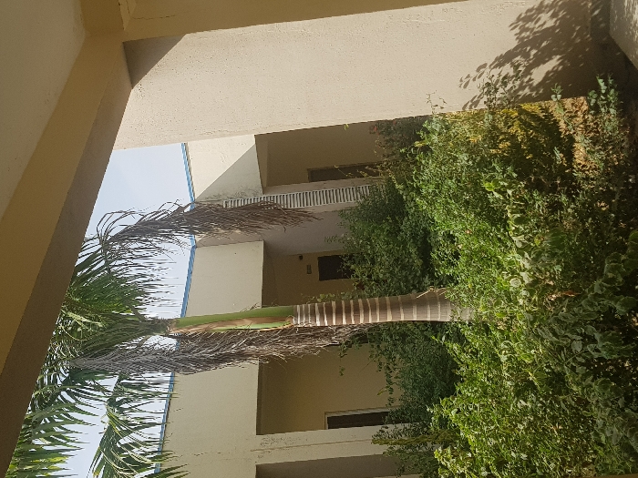 The image depicts an outdoor courtyard area in Panhauya, Nigeria, viewed from beneath a covered structure. A prominent palm tree with a light-colored, ringed trunk and green fronds, some of which are dry and brown, stands centrally. Dense green foliage and shrubbery cover the ground surrounding the palm tree. In the background, light-beige colored buildings with flat roofs and blue coping lines are visible, forming the perimeter of the courtyard. Several recessed doorways or openings are present within these building walls. A vertical slatted or ribbed texture is visible on a section of the building wall to the right. The sky overhead is clear and light blue. Strong natural sunlight illuminates the scene from the left, casting distinct shadows on the right-hand wall and column in the foreground. No individuals or active interactions are observed.