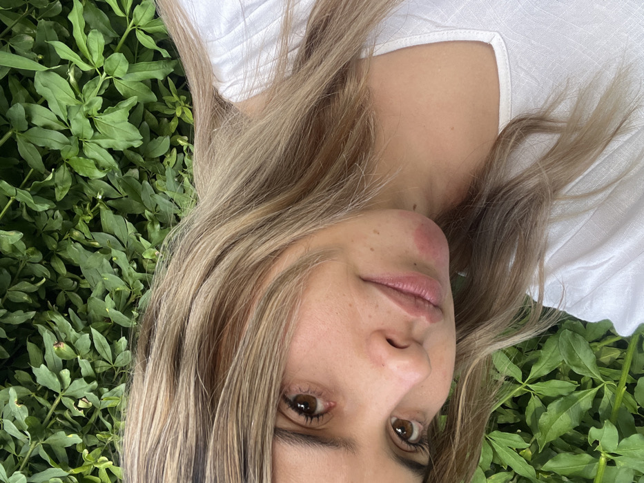 A fair-skinned woman with blonde hair lies in green foliage. She wears a white top. Her face is tilted, and she looks directly at the camera. The background is filled with lush green plants, creating a natural setting. Her lips are light pink. Her eyes are brown.