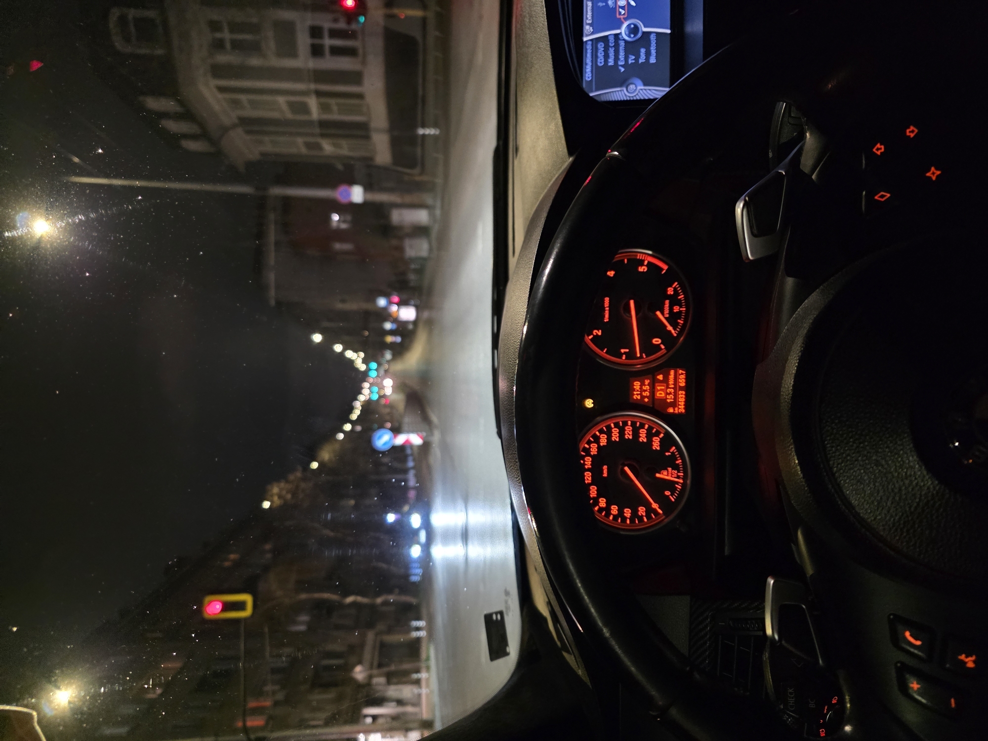 The photograph, taken from inside a moving vehicle at night, captures the urban landscape of an unknown city