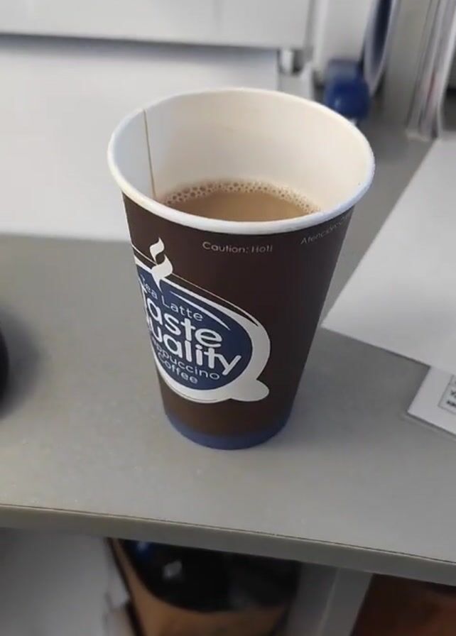 A close-up shot shows a paper coffee cup sitting on a gray surface