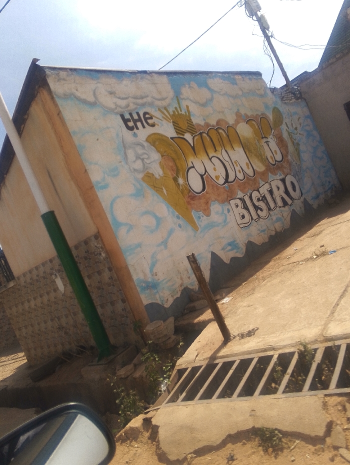 This image depicts an exterior street scene in Jos, Nigeria, focusing on a building wall featuring graffiti art
