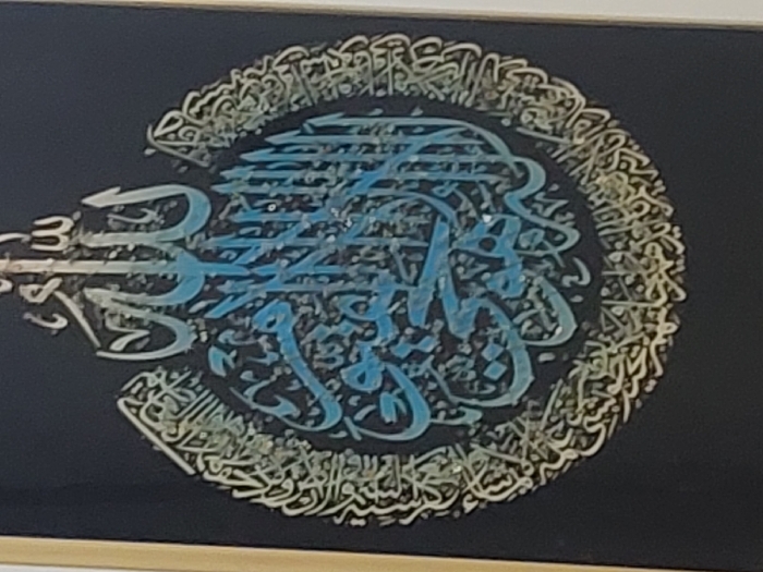 An artistic representation features Arabic calligraphy in circular patterns. The inner script is a light blue, prominent against a darker background, possibly black. This central text is surrounded by a denser, more intricate, gold-hued calligraphy forming an outer ring. The piece appears framed and has a textured quality. It may be a religious or decorative work.