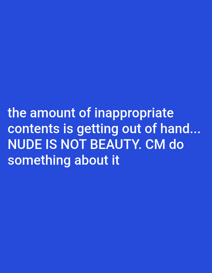 This image presents white text centered on a solid, deep blue background. The text reads: "the amount of inappropriate contents is getting out of hand... NUDE IS NOT BEAUTY. CM do something about it". No other visual elements, figures, objects, or environmental details are depicted within the image. This message is presented in the context of the city of Jos, Nigeria.
