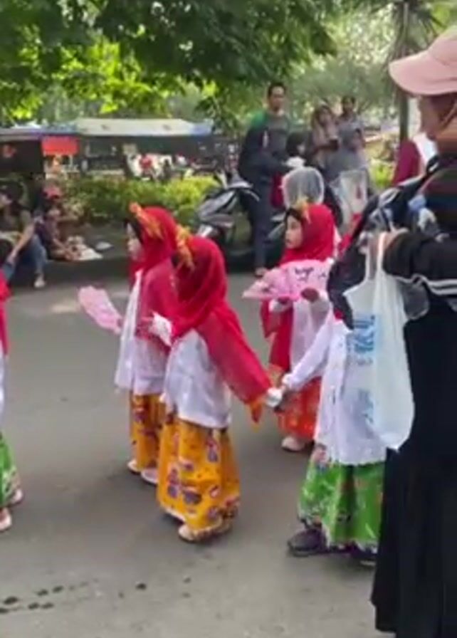 group of children dressed in costumes, likely for a parade or event. The first group consists of young girls in white blouses, colorful patterned skirts, and red headscarves, holding hands. A woman walks beside them, dressed in a black outfit, a tan headscarf, and a light-colored sun hat. The second group of children wear a mix of outfits, some with military-style khaki uniforms and hats, and others in traditional Indonesian attire, complete with batiks and white tops. These children hold up portraits of historical figures on sticks. The setting appears to be an outdoor street or public area, surrounded by trees, buildings, and parked vehicles. People are standing on the sidelines observing the children in costumes.