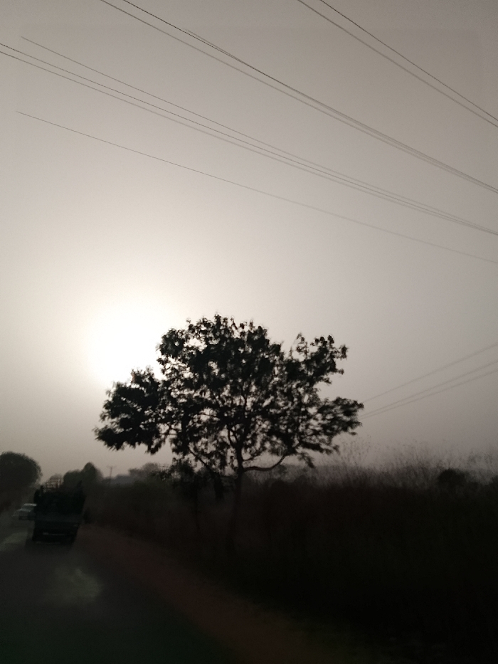 The image depicts a rural or semi-rural roadside scene in Mangu Halle, Nigeria, at either dawn or dusk. The sky, occupying the upper two-thirds of the frame, is a light grey, hazy expanse, traversed diagonally by approximately seven parallel utility lines. A strong, diffuse white light source, characteristic of a low sun, is positioned on the left horizon, partially obscured by a large, dark-silhouetted tree with a full canopy, located slightly left of the image center. To the right of this tree, dense, dark vegetation or tall grass occupies the mid-ground. In the lower-left quadrant, a dark, potentially wet, paved road is visible, extending diagonally into the mid-left background. A dark-colored truck, possibly a cargo vehicle, is present on the road in the mid-left, partially blurred, suggesting movement. Indistinct shapes of additional vehicles are visible further down the road behind the truck. The scene is characterized by strong contrasts between light and shadow, with elements in the foreground and mid-ground appearing as dark silhouettes against the brighter sky.