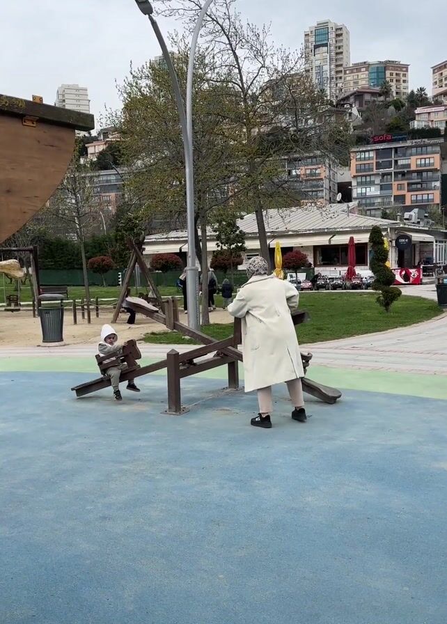 A woman in a light-colored coat and headscarf assists a child in a gray hat and jumpsuit on a four-way seesaw at a park