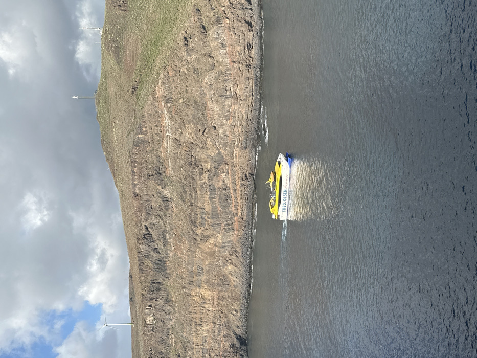 The image displays a yellow and white Fred. Olsen Express catamaran ferry sailing in dark blue waters near the volcanic coastline of San Sebastián de la Gomera, Spain. The ferry, emblazoned with "FRED. OLSEN Express," is actively moving from left to right across the frame, leaving a white wake behind it. In the background, a steep, layered cliff face of brown and reddish-brown volcanic rock rises directly from the sea, where small waves are visible at its base. Above the cliffs, the terrain ascends into a hillside covered with sparse, dry, yellowish-green vegetation. A white wind turbine with three blades is situated on a distant ridge on the upper left. On the highest point of the hill to the right, a white statue, identified as the Monumento a la Virgen de Guadalupe, is mounted on a pole, accompanied by additional communication towers. The sky is largely overcast with heavy grey clouds, though a patch of blue sky and lighter clouds is visible in the upper left quadrant. The scene is captured from an elevated perspective overlooking the water and coastline.