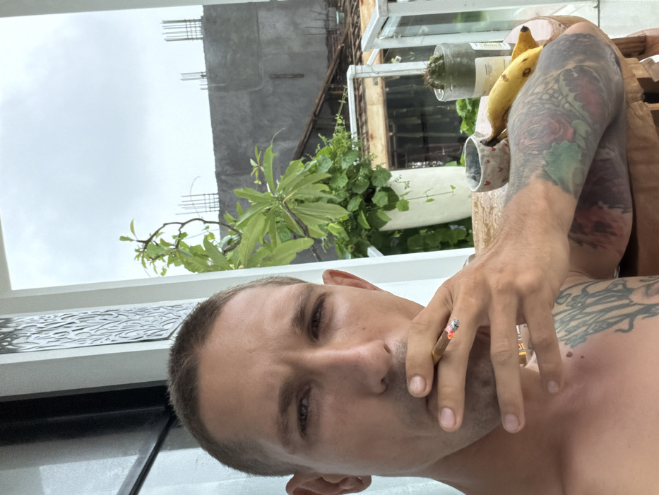 A man with short, light hair and tattoos is holding a lit cigarette near his face. The background shows a window with greenery and buildings. There is a banana and a jar on the right. The photo appears to be taken from a low angle, capturing the man's face and upper body. The lighting suggests it is daytime, possibly outdoors.