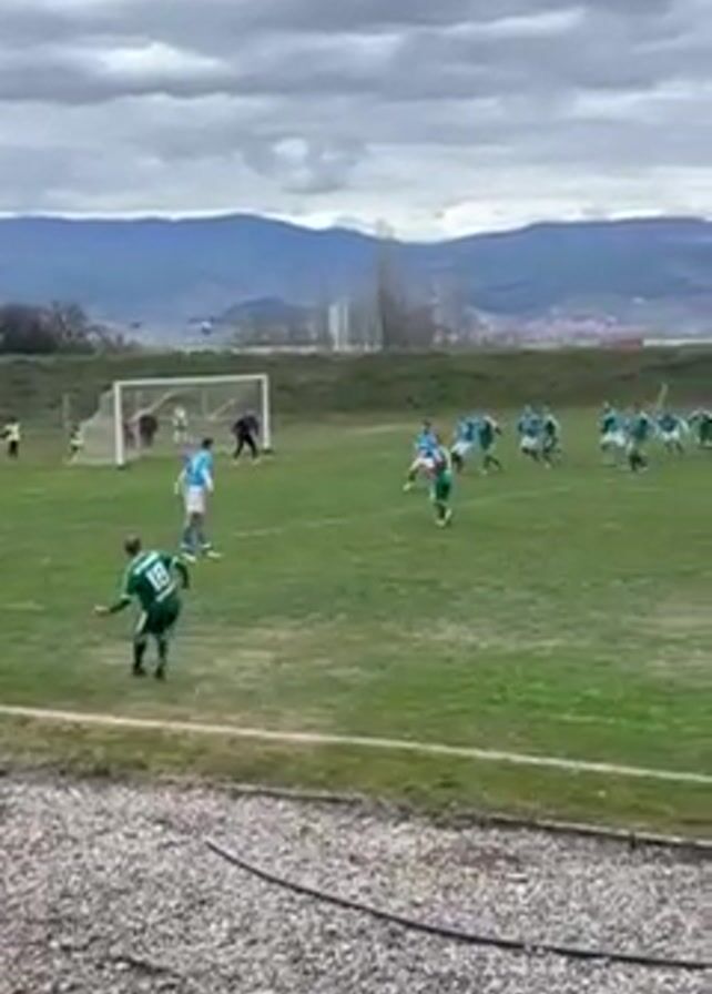soccer match in progress. A group of players, wearing light blue uniforms, is facing off against a team in green. The player in the foreground, wearing number 19 on his green jersey, takes a shot at the goal. The ball sails towards the net where the goalie, dressed in dark clothing, makes a save. The other players on both teams react, trying to gain possession of the ball as it rebounds. The scene is set on a green soccer field, bordered by a rocky edge. In the background are mountains and a cloudy sky.
