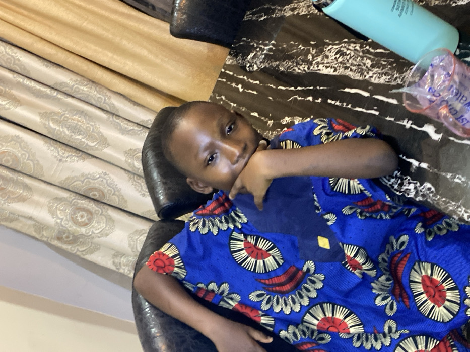 A young boy rests in a leather chair, dressed in a vibrant blue patterned shirt. His right hand gently supports his chin as he looks towards the camera. The scene includes a glimpse of a patterned curtain, a marbled table holding a blue bottle and a plastic pitcher. The setting appears to be a casual indoor space.