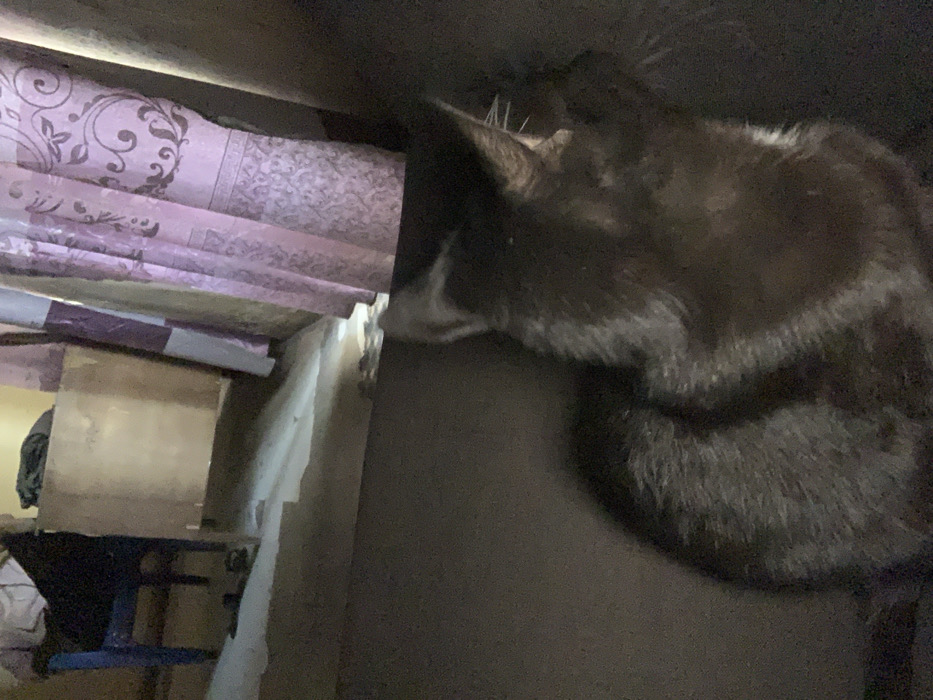 The image depicts an indoor scene within a residence in Barakin Lerawi, Nigeria. In the immediate foreground, a dark-furred cat, likely black or dark tabby, is positioned, facing towards the right with its head, pointed ears, whiskers, and upper body visible. The background reveals a modestly furnished room. On the left, a person is seated on a blue chair, wearing light-colored clothing and dark trousers, with only the lower torso and legs visible. Adjacent to the person and chair is a light-colored wooden structure, possibly a table or counter, topped with dark fabric. To the right of the wooden structure, light purple patterned curtains with a darker floral design hang, partially obscuring a lighter curtain behind them. The floor appears to be a light-colored concrete or tiled surface, illuminated by a localized light source that casts bright areas and shadows. The visible wall sections are light-colored. No direct interaction between the cat and the seated person is observable within the frame.