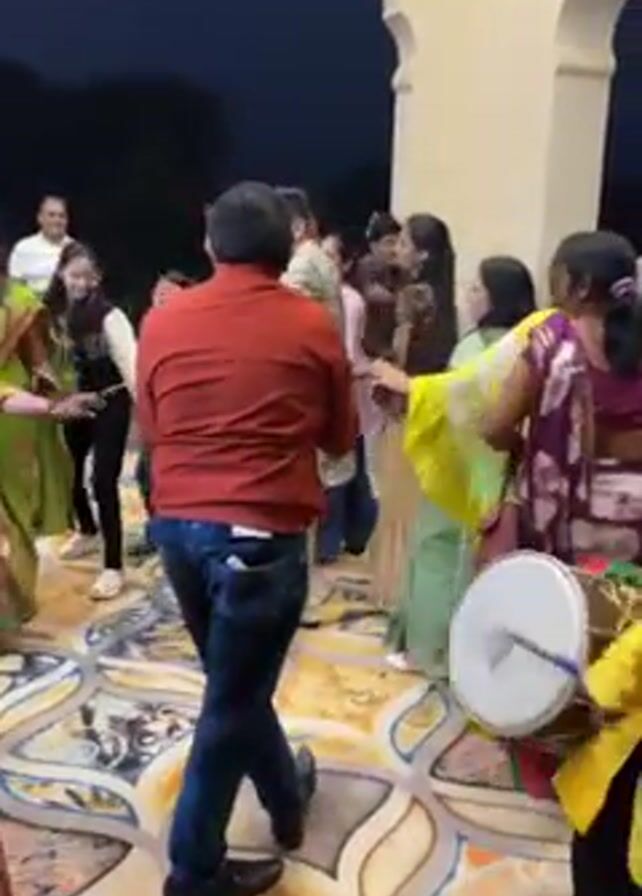 group of people dancing outside, likely at a celebration or gathering. The setting appears to be an open patio or courtyard with arched architectural features. Several individuals are wearing traditional Indian clothing, including sarees and kurtas. A drummer in a yellow outfit plays a small, hand-held drum, providing music for the dancing. People are moving freely, some clapping and raising their hands. The mood appears festive and joyful. The evening sky is visible in the background.