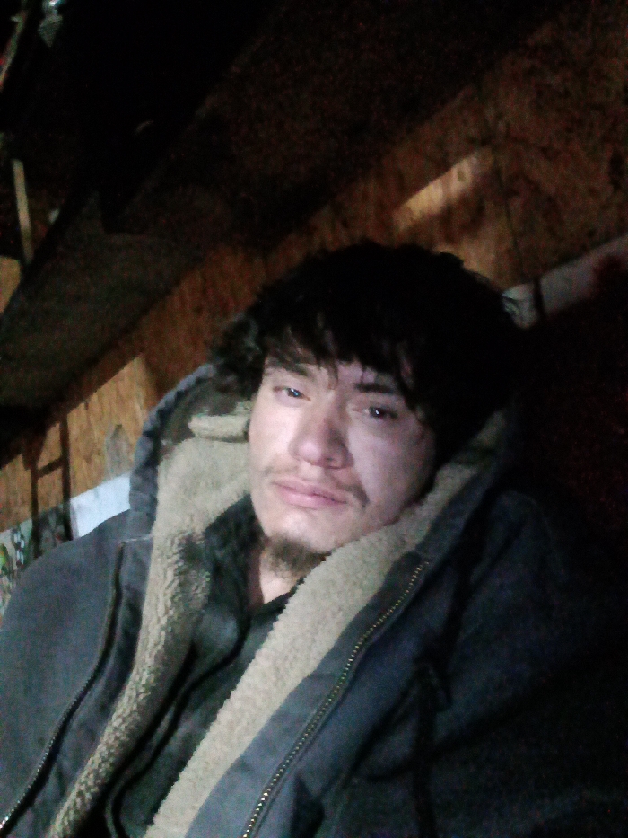 A close-up, slightly upward-angled image depicts one male individual indoors. The subject, an adult male, has dark, wavy hair and facial hair consisting of a mustache and goatee. He is wearing a dark-colored, hooded jacket with a visible beige sherpa lining, open over a dark inner layer. His gaze is directed toward the camera with a neutral expression. The background is dimly lit and consists primarily of rough, light-colored wooden paneling or plywood, with darker, indistinct elements occupying the upper portion. Shadows are pronounced due to the low-light conditions. No specific identifiers for the city of Ozark, United States, are discernible within the visual content of the image.