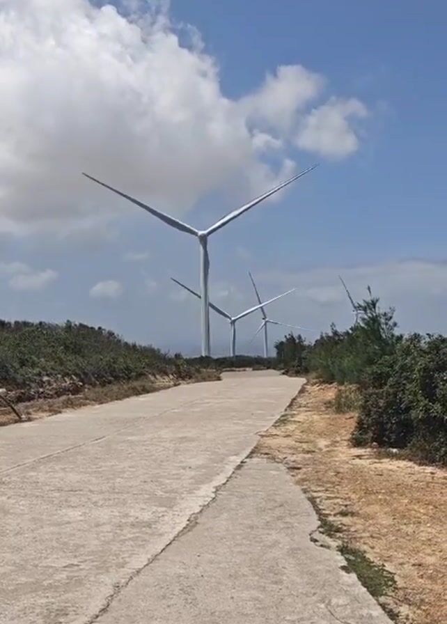 concrete road leading to a row of wind turbines in the distance, under a partly cloudy blue sky. The road is flanked by scrubby vegetation on both sides. The wind turbines are large and white, with three blades each. The blades are rotating slowly. The sky is blue with some scattered white clouds. The overall impression is one of clean energy and a slightly barren landscape.