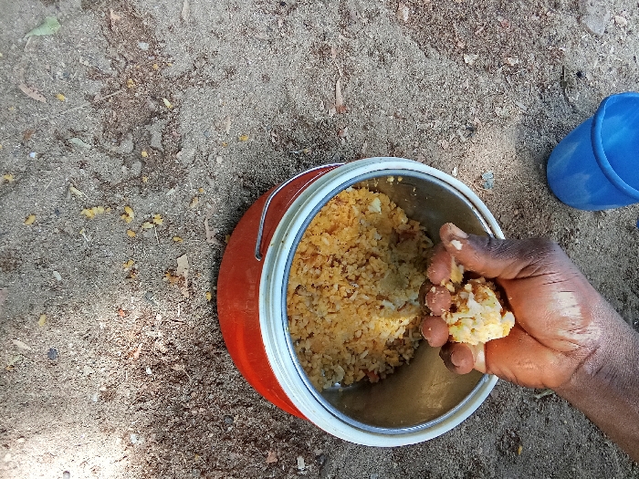 person's hand holding a piece of rice over a red and silver thermos filled with rice. There is a blue cup on the ground next to the thermos. The scene takes place on a dirt ground, likely in an outdoor setting. The image is likely taken in the city of Gudi, Nigeria, located at latitude 8.884 and longitude 8.266. The person appears to be eating rice from the thermos. The focus is on the hand and the rice, suggesting an informal meal or snack.