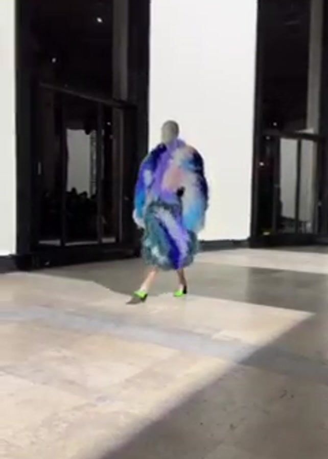 A fashion model wearing a large colorful feather-like coat, green heels, and a mask or covering studded with spikes walks through a large indoor space with large white wall panels and black-framed windows