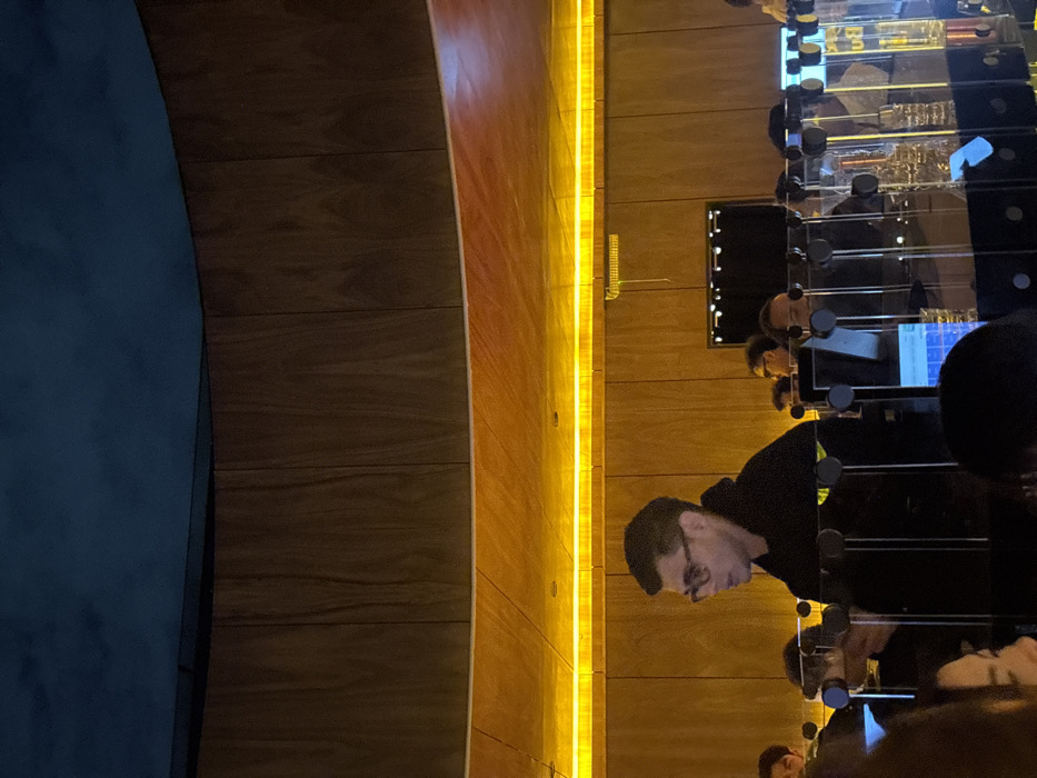 This image depicts the interior of a contemporary mezcal bar located in Mexico City, Mexico. The environment features a distinct architectural design with curved, light-brown wooden paneling forming the upper section of the walls. A prominent, horizontal yellow LED strip light runs along this wooden structure, providing bright, warm illumination to the lower portion of the scene. Above the wooden panels, a dark, possibly blue-toned, ceiling is visible. In the foreground and midground, a bar or counter area is equipped with multiple clear, vertical liquid dispensers, each fitted with a tap mechanism. One dispenser, positioned centrally in the midground, clearly displays the word "MEZCAL". Several individuals are present within the establishment. A male subject, positioned in the left-center foreground, has dark hair, wears eyeglasses, and a dark hoodie, looking towards the left side of the frame. Other patrons are partially visible behind the dispensers and in the background, including one individual wearing headphones and another with a white shirt. The overall lighting is dim, emphasizing the illuminated bar area and the ambient glow from the LED strip.