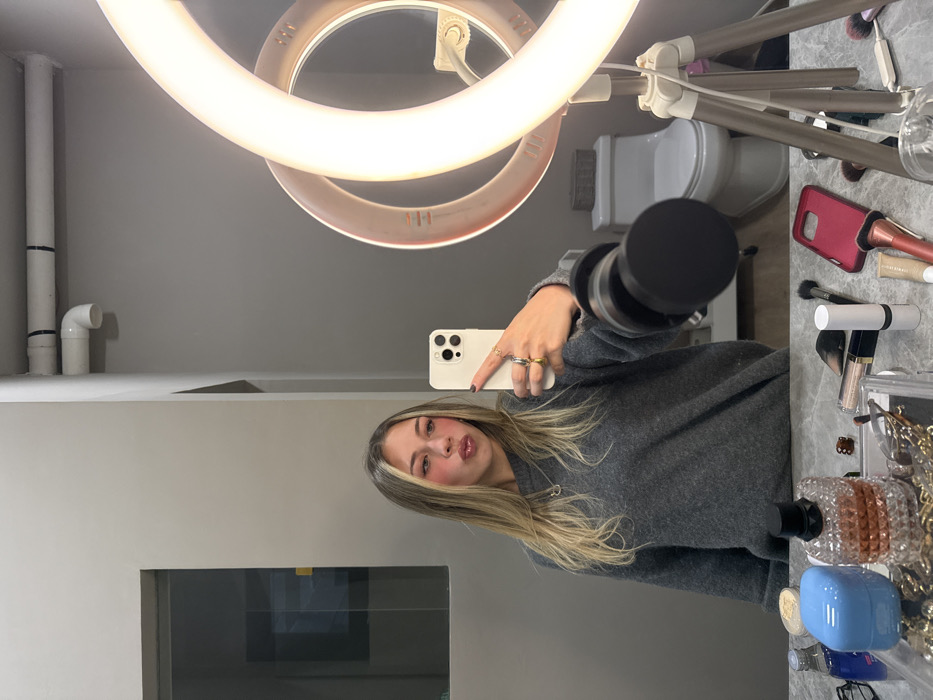 The image depicts a mirror selfie taken by a young female subject within an indoor setting, likely a bathroom or dressing area. The specific location within the city of Monterrey, Mexico, cannot be determined from the visual evidence. The subject, reflected in the mirror, is a light-skinned female with long, blonde hair featuring darker roots. She is wearing a grey, long-sleeved sweater and has visible rings on her left index, middle, and ring fingers. Her fingernails are painted a dark color. She is wearing makeup, including prominent pink blush on her cheeks and a glossy finish on her lips, which are slightly pursed. She holds a light-colored iPhone, equipped with three camera lenses, in her extended left hand, angled to capture her reflection. To the right of the subject in the reflection, a large, illuminated circular ring light stands on a silver tripod. A white toilet with a closed lid is visible in the background, behind and to the right of the ring light. Above the toilet and ring light, white PVC pipes are affixed to the upper wall. The walls of the room are a uniform light grey. To the left of the subject, a dark rectangular area, possibly a window or a door with a glass panel, is reflected. The foreground reveals a light-colored countertop, likely marble or granite, heavily covered with various vanity items. These include a clear, textured perfume bottle (Valentino Born in Roma is discernible on the label), a light blue lidded container, a small blue spray bottle, numerous makeup brushes, a white lipstick tube, a red smartphone case, small brown hair clips, a compact, and other assorted cosmetic bottles and jewelry organized within a clear tray. The female subject is actively engaged in taking her own photograph using the smartphone and the mirror reflection.